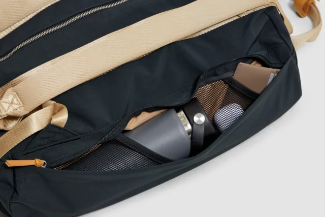 Two zippered side pockets with mesh sleeves keep your water bottle, headphones, and small essentials neatly organized and within reach.
